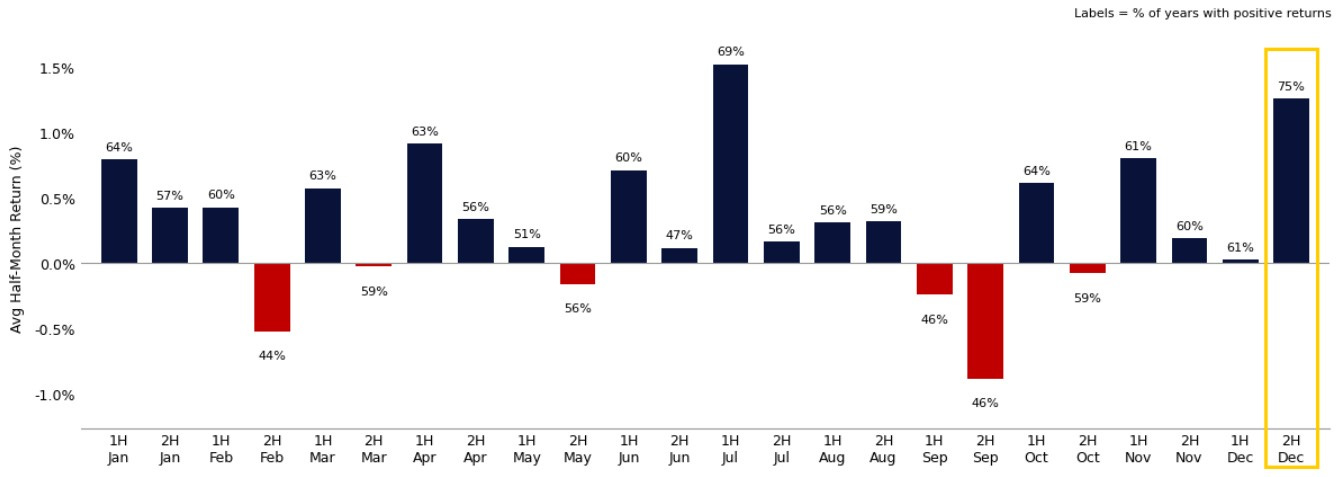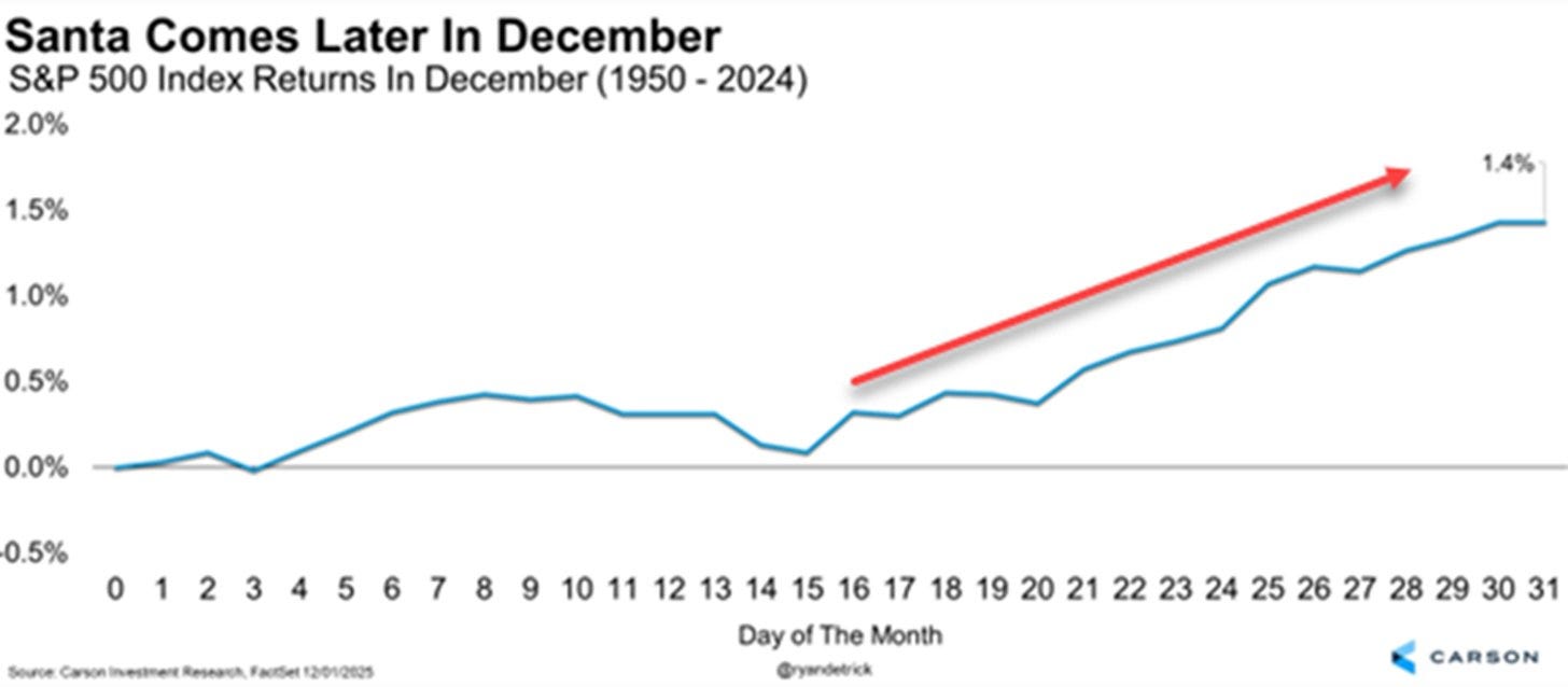 Now, with only a couple of weeks left in 2025 and Powell showing the Fed’s dovish hand, he may have cleared us for a Santa Rally. Over the last century, the back-half of December is actually one of the best periods of the entire year.