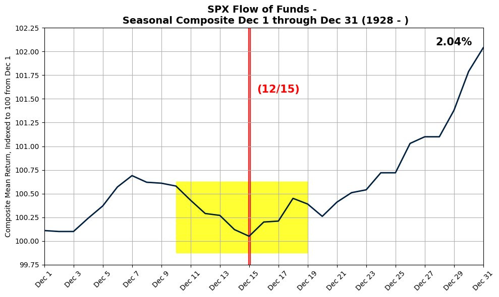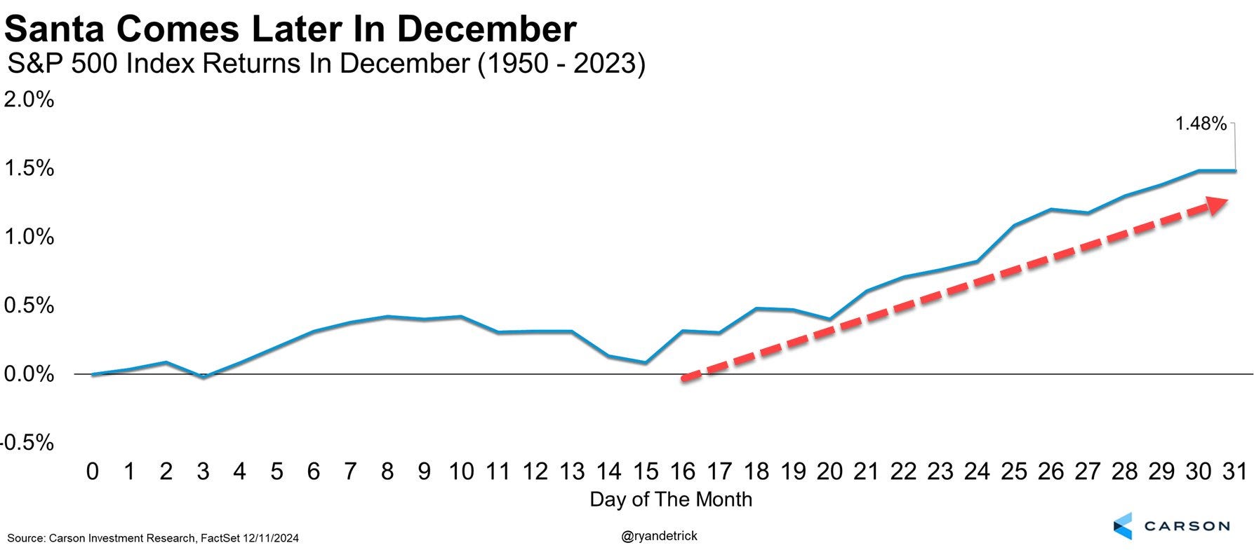 With only a couple of weeks left in 2024, let’s look at how we can expect things to wrap up. Historically, this is actually one of the best 2-week periods of the entire year based on seasonality over the last century. Take a look at the charts below which clearly show how strong average performance is in the second half of December. The last week specifically is commonly referred to as the “Santa Rally”.