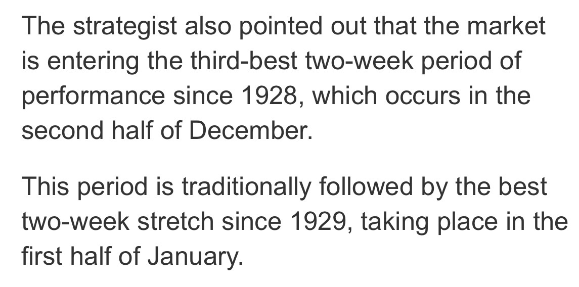 Goldman's flow guru Scott Rubner also just put this out in his recent note: "The last two weeks of December and first two weeks of January are by far the best four-week period of the year with an average return of almost 3%."