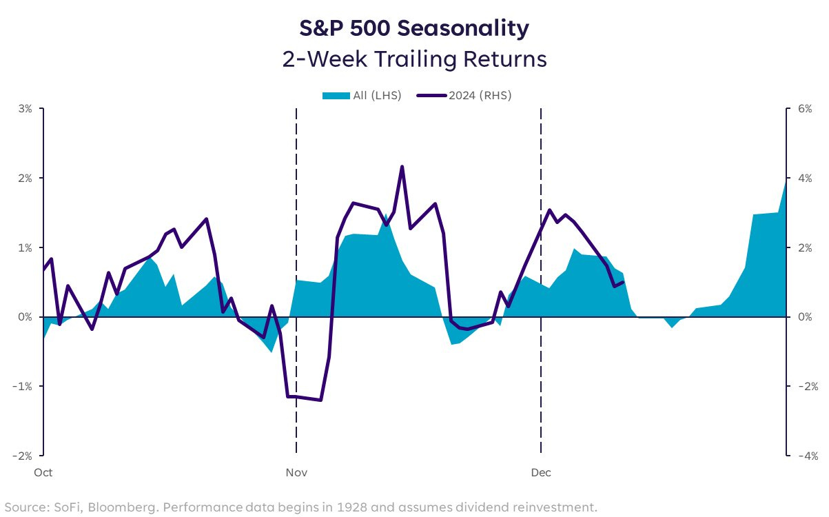 It’s important to note that seasonality and historic performance is not a perfect indicator. Markets can obviously move in completely unpredictable ways. However, in my experience certain periods of the year tend to be more reliable than others when it comes to trends. The back half of December is indeed one of those periods. If you are wondering how 2024 has tracked past seasonality so far, take a look at this chart of Q4: