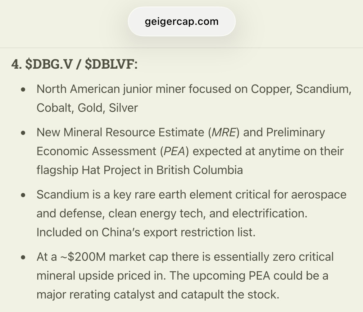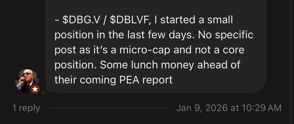 In early January, I told our subscriber chat that I had initiated a small position in $DBLVF and today I am still holding the entire position up ~140%. I believe this company is very undervalued following the Hat Project PEA and it should see significant upside even without a buyout. However, I think an acquisition is now extremely likely in the coming months/quarters and the stock has the potential to go up multiples from here.