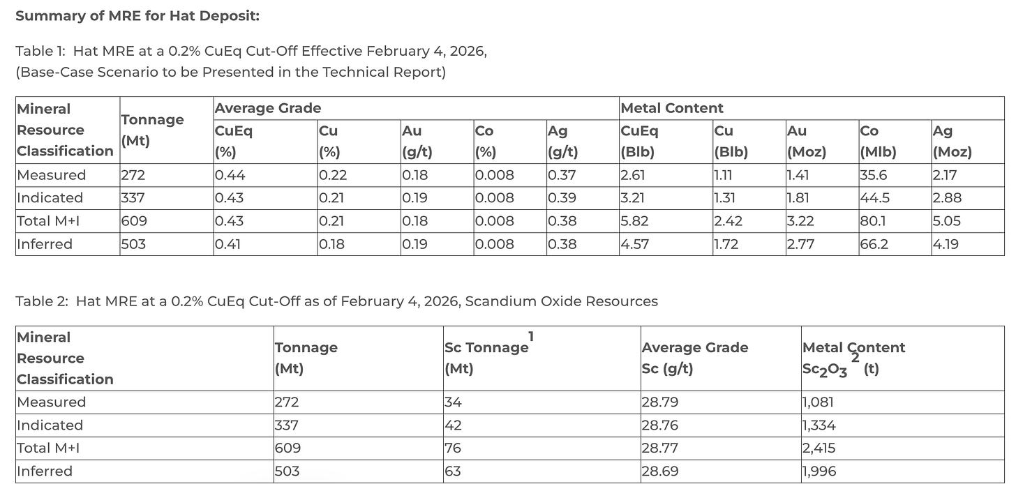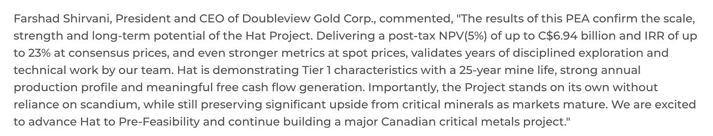 In my 2026 Market Outlook posted back in December, I mentioned a small-cap mining company that subscribers should keep an eye on. It’s name is Doubleview Gold Corp ($DBLVF). Entering the year they were waiting for an updated Mineral Resource Estimate (MRE) and Preliminary Economic Assessment (PEA) for their flagship "Hat Project" deposit in British Columbia.