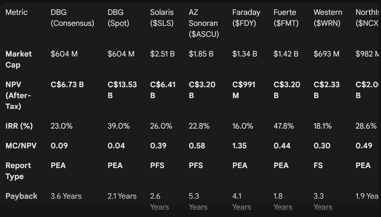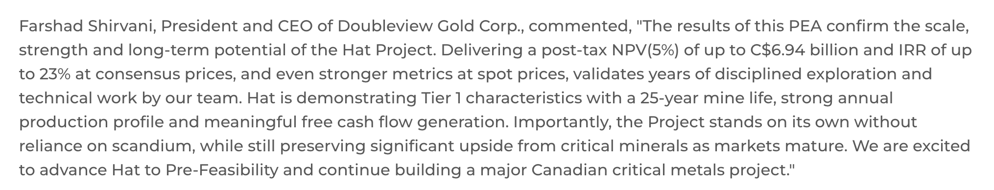 After this PEA the company is immediately moving into a Pre-Feasibility Study (PFS), providing a clear roadmap for early works and permitting activities later this year and into 2027. Doubleview is trading well below it’s peers and the Hat Project appears extremely undervalued even at the "consensus" estimates.